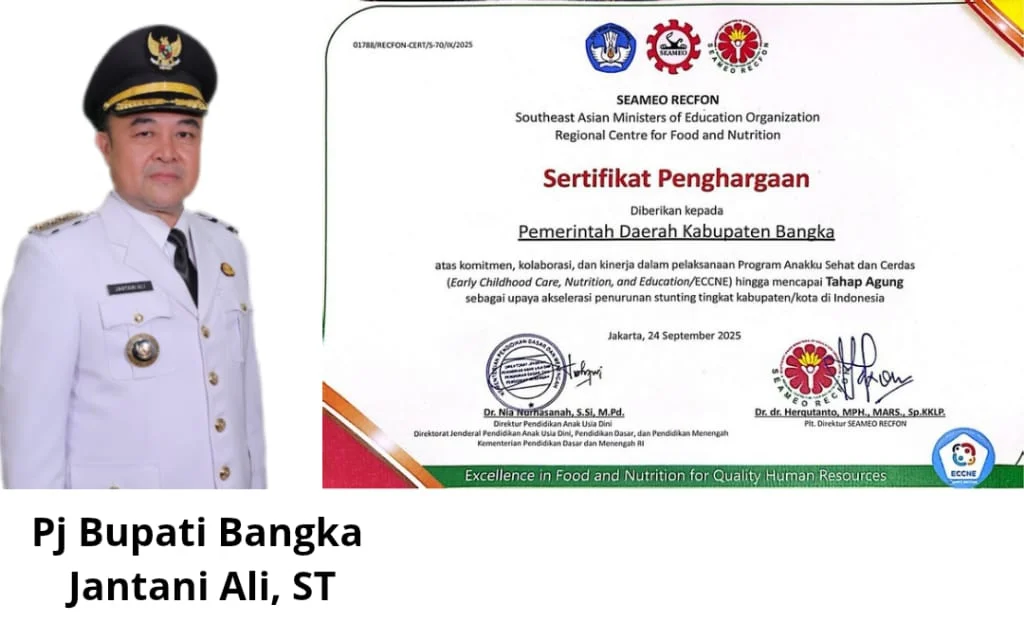 PJ Bupati Bangka, Jantani Ali, menyatakan, “Penghargaan ini diberikan oleh Southeast Asian Ministers of Education Organization – Regional Centre for Food and Nutrition (SEAMEO RECFON) atas keberhasilan daerah dalam menurunkan stunting melalui implementasi Program Anakku Sehat dan Cerdas.