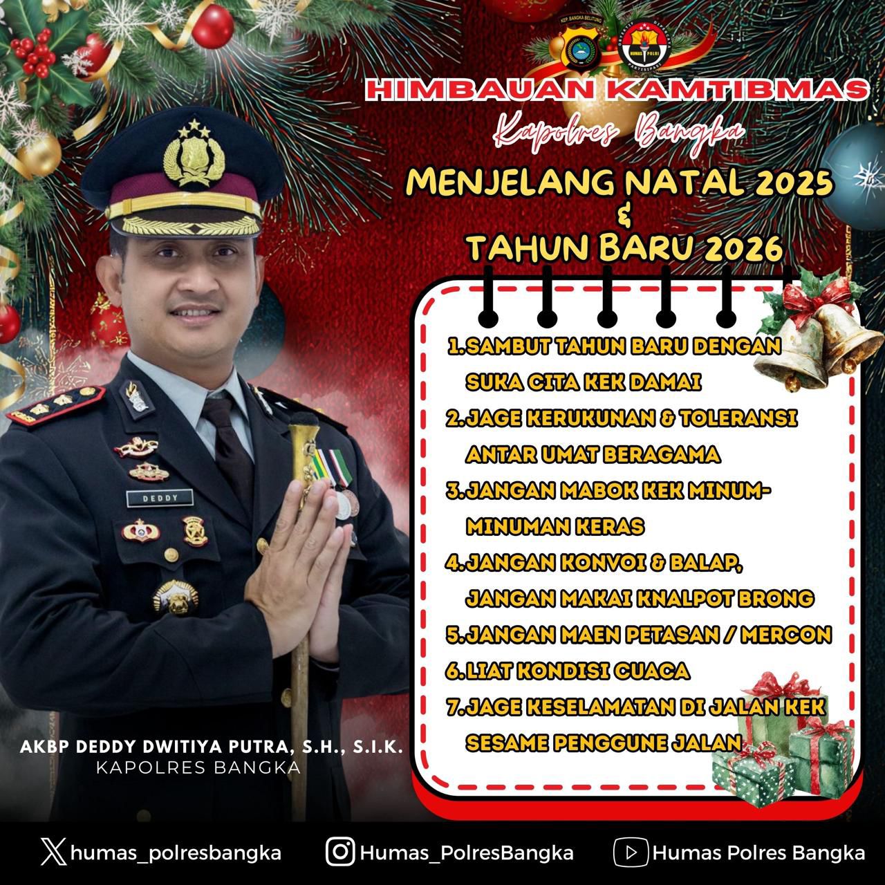 “Perayaan Natal dan Tahun Baru hendaknya dimaknai dengan penuh kebahagiaan tanpa mengesampingkan aspek keamanan dan keselamatan. Mari bersama-sama kita jaga Kabupaten Bangka tetap aman, damai, dan kondusif,” ujar AKBP Deddy Dwitiya Putra.