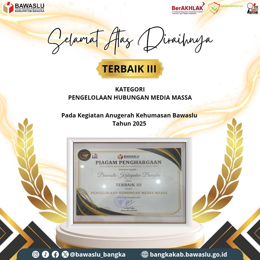 Jakarta, Badan Pengawasan Pemilihan Umum Penaexpres.com : Bawaslu Kabupaten Bangka berhasil meraih prestasi sebagai “Terbaik ke-Tiga Kategori Pengelolaan Media Massa” dalam Anugerah Kehumasan Bawaslu Republik Indonesia Tahun 2025 yang digelar di Jakarta pada Sabtu, 20 Desember 2025.